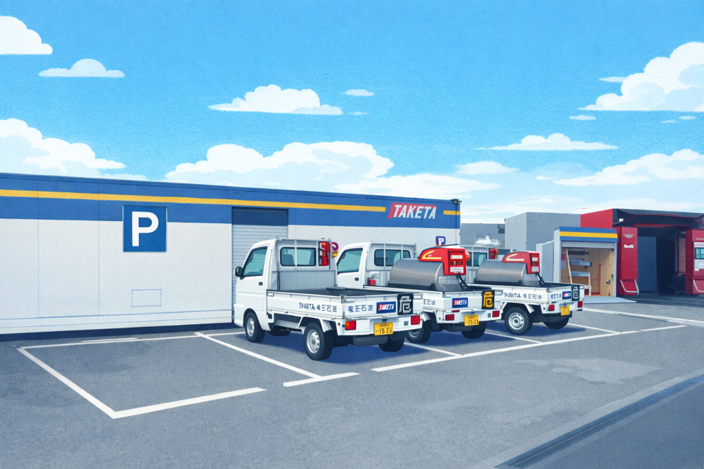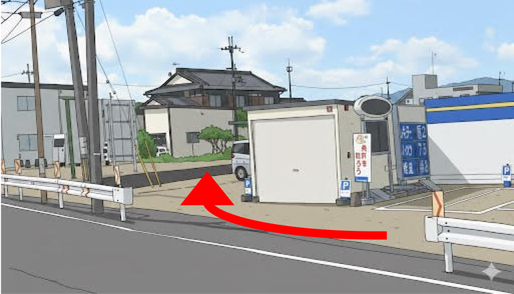 二輪部前には駐車場がございません。路上駐車をされる方がおられますが、近隣の住民の方の迷惑になりますので必ず当店の駐車場へ駐車をお願いします。洗車機側、コンテナ手前の【P】マーク2か所。白いシャッター奥が当店の駐車場です。